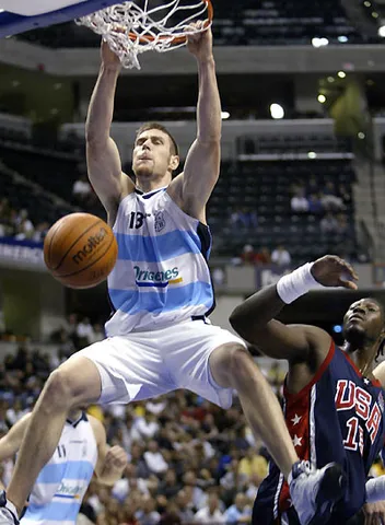 Argentina salió a la cancha con la intención de cambiar la historia. Salió convencida de que su carácter, su intensidad y su juego en equipo eran mucho más importantes que la historia, las estadísticas y sobre todo, las individualidades de la selección estadounidense. Una defensa al hombre muy presionante, con un muy efectivo sistema de ayudas que obligaba a los norteamericanos a lanzar desde posiciones muy incómodas, daba paso a un auténtico homenaje al baloncesto colectivo en ataque. Rápida circulación de balón, Pepe Sánchez ejecutando el pick and roll a la perfección con sus pívots, y generación continua de ventajas que abrían huecos para las penetraciones de Ginóbili y Nocioni, además de un Fabricio Oberto que se mostraba insultantemente superior en la pintura a Ben Wallace, el mejor defensor del planeta en aquella época. No había terminado el primer cuarto y Argentina ya ganaba por 15 (19-34). El Conseco Fieldhouse se frotaba los ojos. El vendaval albiceleste continuaba en el segundo cuarto con jugadas como un mate estratosférico de Nocioni (en la imagen adjunta) a pase de Pepe Sánchez, y una bandeja tras penetración jordanesca de Ginóbili que puso los 20 de diferencia antes del descanso (32-52). Argentina no ganaba; Argentina estaba pulverizando a Estados Unidos en su propia casa.