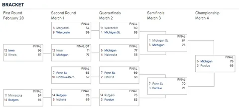 También siguieron adelante Wisconsin y Penn State de la mano de sus estrellas, Ethan Happ y Tony Carr respectivamente. La sorpresa de la jornada la dio Rutgers tras vencer a Indiana por 76-69. El viernes los cuartos de final nos depararon grandes duelos. Michigan State sufrió para ganar a una peleona Wisconsin por 60-63. Bonito duelo entre Miles Bridges (20 puntos y 9 rebotes) y Ethan Happ (22 puntos y 4 rebotes) en otro partido en el que Jaren Jackson pasó desapercibido (7 puntos y 5 faltas en 15 minutos). Michigan siguió con su paseo tras vencer con facilidad a Nebraska por 77-58. Por el otro lado del cuadro, la Penn State de Tony Carr (25 puntos, 6 rebotes y 5 asistencias) venció a la Ohio State de Keita Bates-Diop (25 puntos y 5 rebotes) por 69-68. Purdue comenzó con un sólido triunfo ante Rutgers por 82-75. En semifinales Michigan se cargó a los Spartans de Tom Izzo por 75-64, gracias a una gran segunda parte en la que se encomendaron de nuevo al alemán Wagner (15 puntos y 8 rebotes). La pareja Jackson-Briges no pudo hacer nada a pesar de sus buenos números, 13 y 17 puntos respecitvamente ambos con 7 rebotes capturados. Purdue sacó adelante su duelo ante Penn State por 70-78, guiados por Carsen Edwards con 27 puntos. Los Boilermakers secaron a Tony Carr (12 puntos con 4/18 en tiros de campo), pero apareció Shep Garner con 33 puntos para plantar batalla a los favoritos. En la final se encontraron Michigan, la relativa sorpresa, y Purdue, el premio de la regularidad. Partido igualado en el qu,e a traves del Pick and roll y de la inesperada aparación de Jon Teske, los Wolverines rompieron el partido a mediados de la segunda parte. Purdue hecho de menos la mejor versión de Carsen Edwards y los 23 puntos de Isaac Haas no fueron suficientes. Al final, Michigan campeón con Moritz Wagner como MVP y billete asegurado para el gran baile.