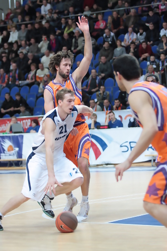 Las primeras ventajas valencianas llegaron al final del primer periodo, gracias a un triple desde medio campo sobre la bocina de Marinovic, que dejaba a los suyos 4 arriba al final de estos primeros 10 minutos (13-17). Los valencianos pusieron la directa en el segundo periodo, estableciendo un parcial de 9-29 que les llevaba a vestuarios con una cómoda renta de 24 puntos (22-46). Todo parecía hecho. Tal vez fue el exceso de confianza lo que permitió revivir a los locales tras el descanso. Ahora sería el BC Triumph el que endosaría a su rival un espectacular parcial de 24-4 que devolvería la igualdad en el marcador a falta de disputarse el último periodo (50-54). Malos presagios para los taronjas, más si cabe cuando los rusos lograron empatar el encuentro nada más comenzar el tiempo definitivo. Sin embargo, el buen hacer de De Colo y Nielsen permitió a los de Spahija lograr una importante victoria en un partido extraño y pobre en juego (59-64).
