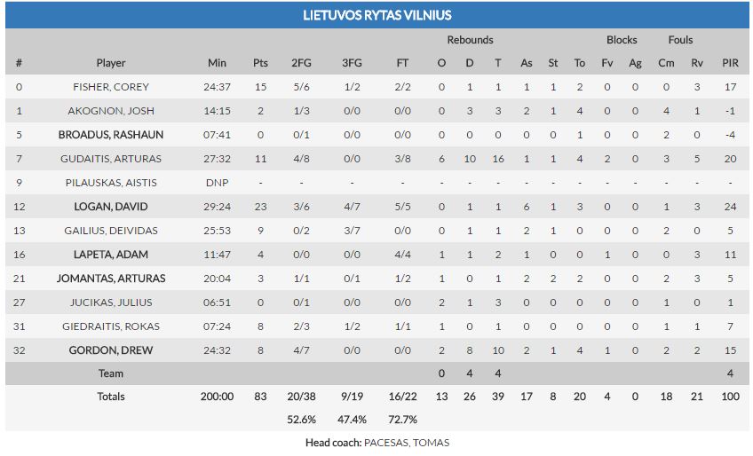1. LOCOMOTORAS LOGAN. Que David Logan es el líder de los lituanos lo sabe todo el mundo, pero el nivel al que rendía (9 puntos, 2 asistencias), y hacía funcionar a los suyos en el primer periodo, marcaba las primeras ventajas locales en el luminoso. Si al buen hacer del americano, le sumamos la diferencia reboteadora (16-4) y el desacierto ofensivo de los Hombres de Negro (3/15 en tiros de campo), podemos entender el 21-9 con el que se cerraba el primer cuarto.