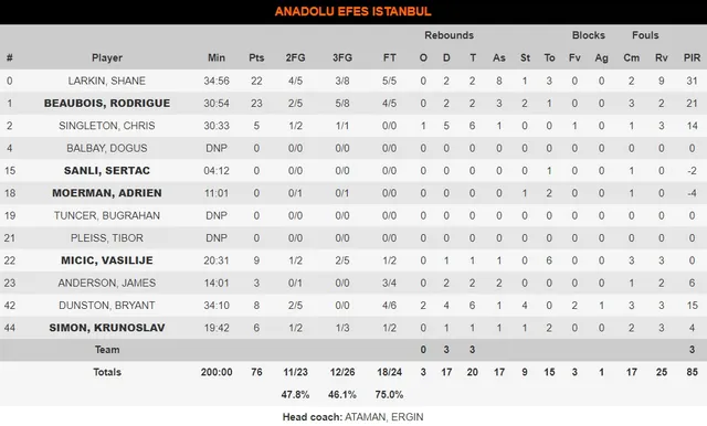 El parcial del Real Madrid parecía que marcaría la tendencia de este cuarto partido. Sin embargo, Anadolu Efes es un equipo con química de campeón, y así lo demostraron. El parcial de 17-34 en el segundo cuarto mantuvo al conjunto turco para darle la vuelta a la tortilla. Y no fue precisamente francesa, ya que Rodrigue Beaubois se encargó de cocinar con mucho condimento. El escolta francés anotó 21 puntos, con un inmaculado 5/5 desde el triple, para poner a los suyos por encima de los 10 puntos y salir con ventaja al descanso.