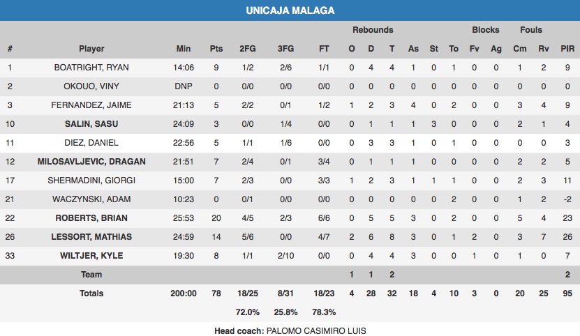 Un mal día desde el triple. 8 de 31 en triples para Unicaja de Málaga con Brian Roberts como único jugador salvable (2/3). Los jugadores malagueños tuvieron una mala distancia desde la larga distancia, abusando del lanzamiento pese a estar desacertador: Wiltjer (2/10), Dani Díez (1/6), Boatright (2/6),…