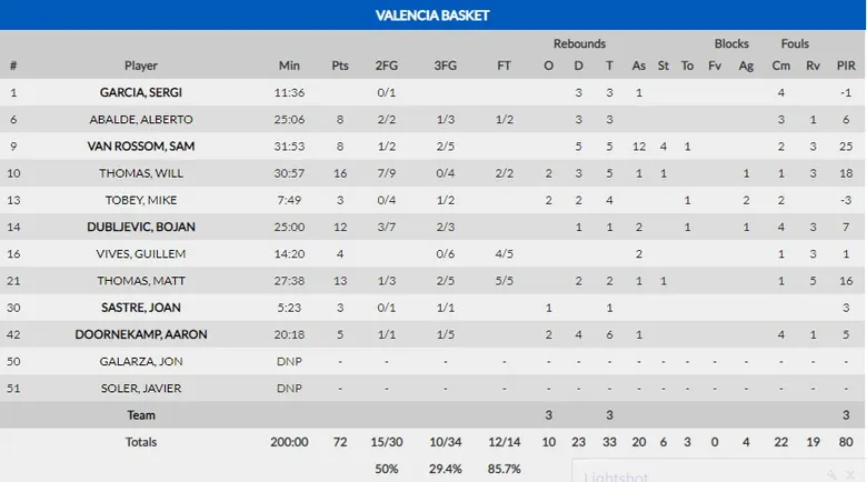 Sam Van Rossom y un buen quinteto. No cabe duda que el belga fue el MVP del partido jugando como “un base de los de antes”. Solo necesito 8 puntos para valorar 25 y fue gracias a sus 12 asistencias, 5 rebotes y 4 robos. Pero también es cierto que este Valencia, otra vez repleto de bajas que hoy llegó con 10 jugadores del primer equipo, con Tobey recién recuperado y con Sastre lesionándose habiendo jugado 5 minutos, necesitaba que varios dieran un paso al frente. Y hoy lo dio un buen quinteto, comandado por Van Rossom, con Will Thomas que sigue en un gran estado de forma y Dubljevic que anotó en la remontada como buena pareja interior, y con la conexión gallega, Matt Thomas y Alberto Abalde, comandando un parcial de 12 a 0 (5 puntos para cada uno) en el inicio del tercer cuarto que fue clave. El experimento, motivado por las bajas, de jugar con dos bases no funcionó. Exceptuando a Sam y Will, los otros tres no fueron regulares, pero todos fueron claves en la victoria y también hay que destacar la defensa de Abalde a Landesberg.