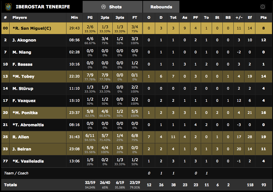 El primer cuarto comenzaba trabado, como sucede en casi todos los partidos de esta competición. Muchas imprecisiones y errores por parte de ambos equipos, un hábitat donde los griegos parece que se desenvolvían de manera muy cómoda. También existía una dependencia de la anotación de Ponitka, que finalizaba el cuarto con 7 puntos, pero o anotaba él o no lo hacía nadie. Los helenos dominaban durante todo el período pero desde la entrada de la nueva adquisición, Akognon, los locales fueron sumando poco a poco desde la línea de personal y sumado a un impresionante buzzer beater del nigeriano permitía cerrar el cuarto con los laguneros por delante. 16-15. En el segundo cuarto, los equipos se soltaron la melena y se convirtió en un festival anotador por parte de ambos bandos. La ventaja se alternaba y también el dominio en el luminoso, hasta que Rosco Allen anotaba una bandeja faltando 6 minutos que ponía a los aurinegros 28-24, seguido de un triple de Vasileiadis. Esta ventaja sería la máxima establecida por el Iberostar, que trataba de mantener la ventaja mientras el PAOK no conseguía reducirla, en gran parte gracias a Tobey y Akognon, quien anotaba 7 puntos en el segundo cuarto. 46-39 con el Iberostar anotando 30 puntos.