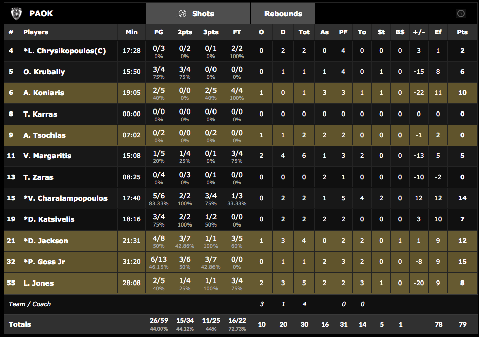 - Phil Goss JR. El veterano americano fue el que llevó la batuta de su equipo durante todo el choque, anotando 15 puntos y se notaba su ausencia en los 9 minutos del choque que no disputaba, o cuando sus acciones en ataque no daban frutos. Esto hacía que el PAOK viviera a base de parciales para intentar remontar pero de manera insuficiente.