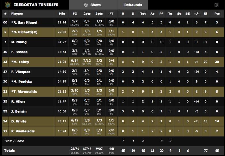 Lanzamiento exterior. Los visitantes, al igual que los locales, presentaron unos pobres porcentajes de tiros de campo. Ambos no superaban el 40%. Pero la gran diferencia radica en los 11 lanzamientos desde el 6,75 que anotaban los letones. Añadido a los 17 tiros libres lanzados por los 8 de los laguneros son muchos puntos gratis y difíciles de recuperar por otro lado cuando tu máximo estandarte se lesiona.