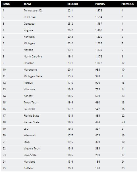 Antes de empezar con las grandes conferencias, indicar que el Top 25 de la semana pasada, publicado el lunes 11 de febrero, es el siguiente: