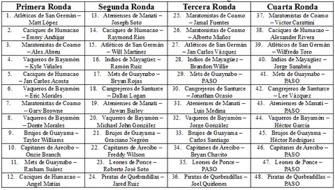 Como era de esperarse, el pívot Matt Lopez fue el primer pick del draft al ser escogido por los Atléticos de San Germán. El restante del sorteo transcurrió de la siguiente manera: