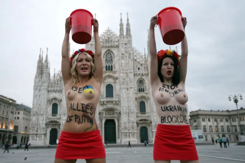 Milano se convirtió a finales de la semana pasada en la capital de la política internacional. La cumbre euroasiática reunió a 53 jefes de estado (representación del 60% de la población mundial, la mitad del PIB y el 70% del comercio mundial). El asunto más mediático y uno de los principales quebraderos de cabeza en el mundo de la política y diplomacia sigue siendo la tensión Rusia-Ucrania. Tensión in crescendo que se encargó de encender Vladimir Putin, quien volvió a amenzar con regular a la baja la exportación de gas.En la previa del encuentro entre los líderes ruso y ucraniano, Putin y Poroshenko, unas activistas pro ucranianas se mostraban de esta guisa delante del Duomo. (Foto AFP/LaNazione).