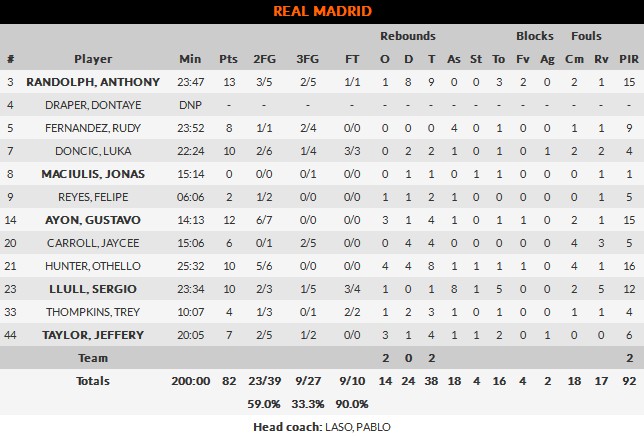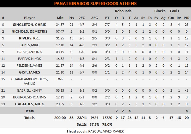 Gist, que reapareció tras perderse 18 encuentros de Euroliga, ejerció de líder del Panathinaikos en el tramo inicial, pero un 2+1 de Doncic, otro triple de Jaycee Carroll y una canasta de Hunter dieron ventaja a los de Pablo Laso. Una ventaja que sería la última, ya que esta vez fueron Singleton y James los que permitieron a los suyos tomar aire. Rudy encestó un triple a falta de 2 minutos que acercaba al Real Madrid a tres puntos, pero Mike James respondió de la misma manera poniendo el partido muy cuesta arriba a los blancos. No fallaron Ioannis Bourousis, Singleton y Nikos Pappas desde la línea de los tiros libres y de poco sirvieron los 6 puntos finales anotados a la desesperada por Ayón (88-82).