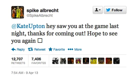 Pero el Mito Albrecht no termina ahí, y es que aprovechando el tirón de su excelente Final Four, sobretodo en el encuentro final, a pesar de la derrota no dudó en utilizar twitter para lanzar un globo sonda, ya que durante el partido pudo ver en las gradas a la actriz y supermodelo Kate Upton. Spike, que durante su excelente primera mitad ganó más de 20.000 seguidores, se armó de valentía y usó la red social para tantear a la joven portada de bañadores en Sports Illustrated y de ropa interior en Victoria´s Secret y la citó twitteando: "@KateUpton: Hey! Te he visto en el partido esta noche. Gracias por venir. Espero volver a verte." Ahora o nunca debió pensar el jugador natural del estado de Indiana.