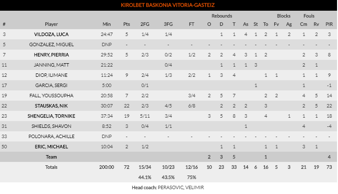 Por fin, Baskonia vuelve a ganar fuera: Desde la primera jornada de Euroliga donde Baskonia ganó al Zalgiris en su feudo en Kaunas, los hombres de Perasovic no habían vuelto a ganar fuera de casa. Desde entonces, 5 derrotas y ninguna victoria, y lo peor, unas sensaciones de que lejos del Buesa Baskonia era un equipo estéril. Pero hoy, por fin los vitorianos han roto esa mala racha y han conseguido ganar fuera de casa. Estando como está esta Euroleague, se antoja imprescindible ganar fuera de casa para ocupar los puestos altos.