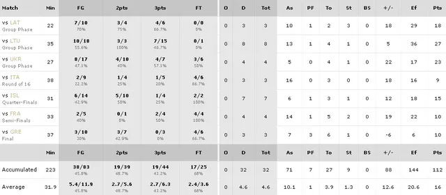Como anécdota al Europeo sub 20, un dato que podemos aportar con respecto a este jugador, es que ha conseguido el record de asistencias en la categoría. No en cuanto al total, ya que en 2014 el esloveno Matic Rebec realizó 81 pases de canastas, pero cierto es que lo consiguió gracias a que jugó dos partidos más, debido a que el sistema de competición era distinto.