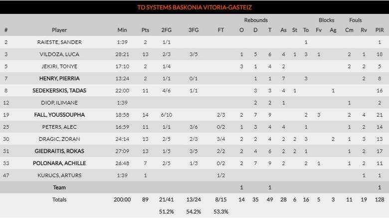 Lo más positivo de este partido para Baskonia, además de la victoria, fue el gran rendimiento coral de su plantilla. Hasta seis jugadores sumaron en dobles dígitos de anotación y siete fueron los que superaron la decena en valoración. Y hay que señalar que Pierria Henry no fue ninguno de ellos, ya que solo jugó 13:24, como si Dusko quisiera borrar cualquier atisbo de la dependencia que se vivió en la semifinal de Copa contra el Barça. Importante destacar el buen papel de jugadores como Sedekerskis, Fall y Dragic, que se sumaron a habituales como Polonara, Giedraitis, Peters y Vildoza.
