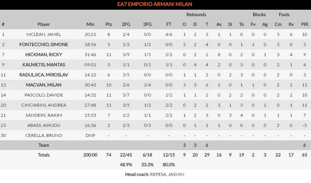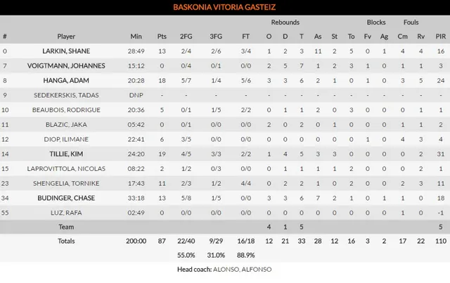 Por su parte, en Milano pocos hombres destacaron, siendo los más valorados los mencionados Macvan y Cincinari con 11, y después Pascolo y McNeal con 10. Un gran contraste con los 16 de Larkin (gracias a 13 puntos y 11 asistencias), los 24 de Hanga y los 18 de Budinger. La valoración final fue un corolario de lo ocurrido hasta el momento: 110-65 para Baskonia, con un dominio absoluto de casi todos los apartados del juego, y solo empañado por la relajación final, que dejó el 87-74 que cerró el choque.