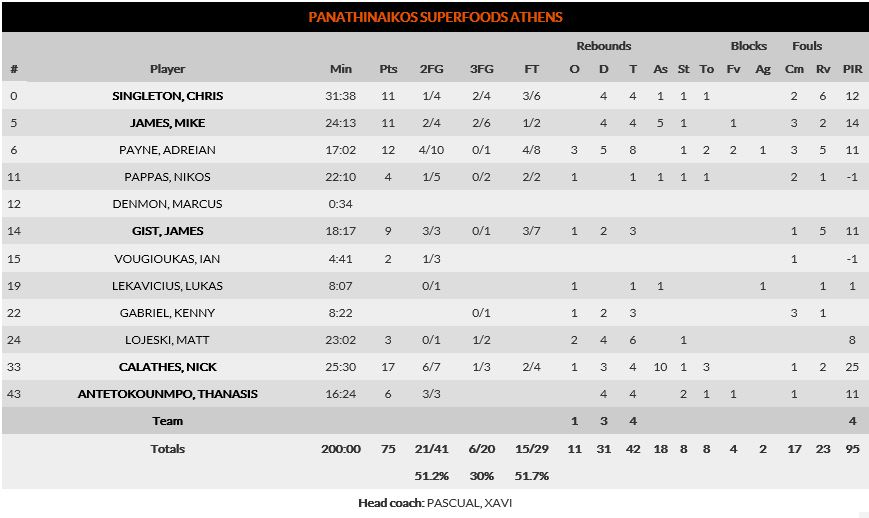 1- La regularidad griega. Nick Calathes fue el director de juego de un Panathinaikos que se mantuvo regular durante todo el encuentro en ataque. El griego anotó 17 puntos, pero estuvo bien secundado por Mike James (11 puntos), Adreian Payne (12 puntos) y Chris Singleton (11 puntos). Aunque bajaron el ritmo durante los últimos cuartos, no les hizo falta mostrar su mejor versión para llevarse la victoria en su casa, pues contaron con una buena efectividad ofensiva.