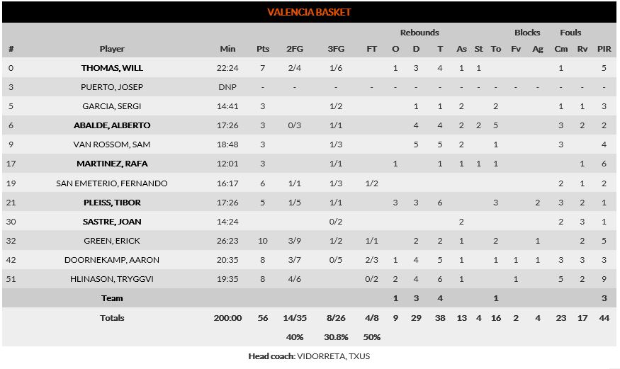 2- Un Valencia bloqueado ofensivamente. Pero si hay algo que decantó el encuentro fue la gran defensa que ejecutaron los griegos ante su rival, pues Valencia Basket no fue capaz de efectuar buenos pases y una circulación de balón holgada. Muchos problemas encontraron los bases taronja para dirigir el ataque, y ante eso, la defensa también les costaba mucho más, eso en el último encuentro fuera de casa en una competición que se acaba para ellos.