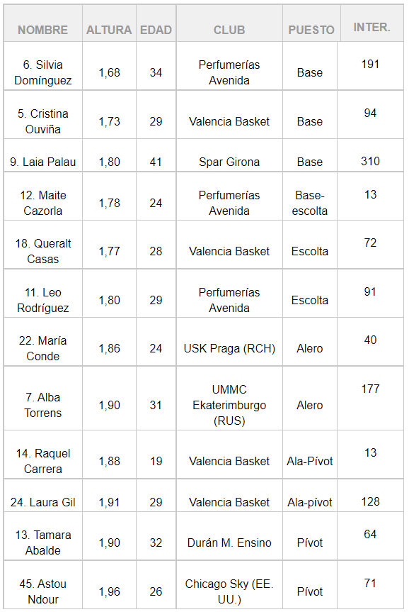 Lucas Mondelo confía en casi las mismas jugadoras que disputaron el Eurobasket 2021. Recupera a Tamara Abalde y Alba Torrens, que se perdieron la cita europea debido a positivos por Covid-19 y deja como descartes a Laura Quevedo y Paula Ginzo, que han disputado los dos amistosos ante Francia (ganó el primero, celebrado en Málaga (72-61) y perdió el de París (80-75)).