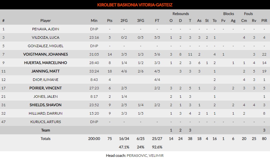 Kirolbet Baskonia perdió 16 balones. El principal quebradero de cabeza del conjunto de Velimir Perasovic pasó por lo mal que cuidaron el balón. La pequeña ventaja con la que se fueron al descanso podría haber sido mucho mayor, de no ser por dar vida a un Darussafaka que las aprovechó con canastas fáciles, y al final le propiciaron la victoria.
