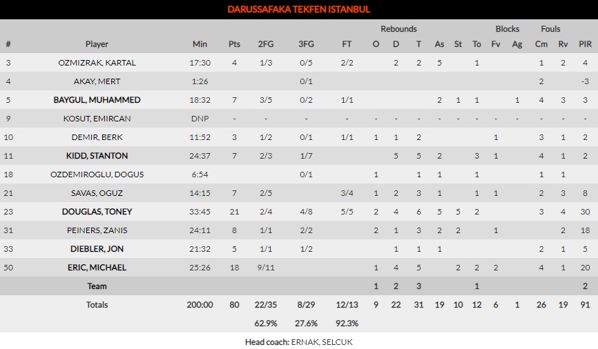 Problemas con las faltas. Si lo más negativo en la primera mitad fueron las pérdidas, Darussafaka aprovechó al máximo el problema que mantuvo Kirolbet Baskonia con las faltas. Desde el tercer cuarto, Vincent Poirier, Ilimane Diop y Luca Vildoza tenían 3 faltas, a lo que Toney Douglas y Michael Eric no dudaron en atacar. Una defensa débil y que apenas presentaba oposición permitió al conjunto local hacerse con una ventaja que no dejó escapar.