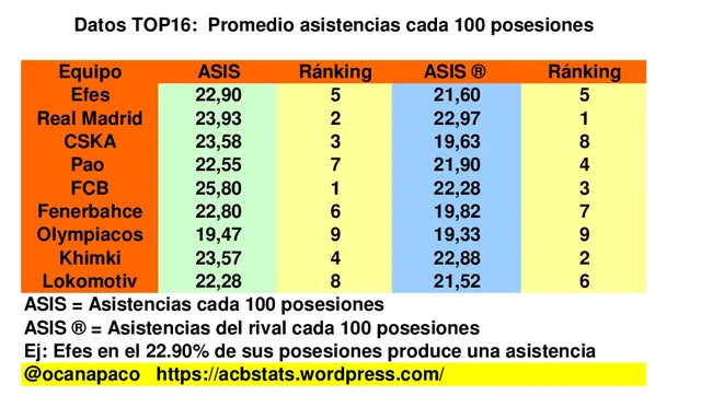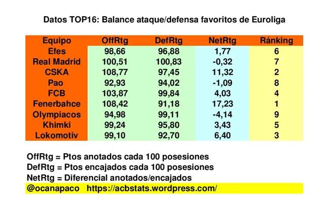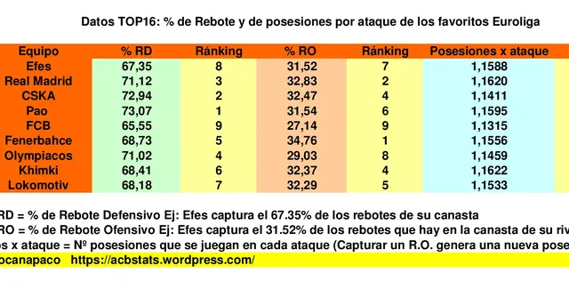 El aspecto más llamativo es el gran porcentaje de tiro de campo que muestran CSKA y Fenerbahçe, y de nuevo los altos % de tiro de los rivales de los equipos españoles, en particular el FC Barcelona es el 2º peor del grupo de principales candidatos.