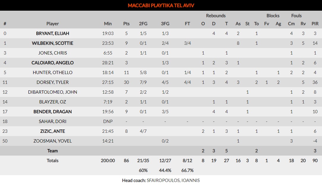 Cuando más necesitaba Maccabi una referencia ofensiva ante la asfixiante defensa sobre Scottie Wilbekin de Jeff Taylor, apareció, desde California, Tyler Dorsey. Con sus 30 puntos, con 7/9 en tiros de 2 y 4/5 en triples, 4 rebotes y 3 asistencias, le valió para ser el hombre del partido y quien desequilibrase la balanza. Destacan sus dos pérdidas, una al final del encuentro en el momento más inoportuno, por la cantidad de balón que amasó durante el choque. Aprovechó la indecisión de los defensas interiores blancos de salir a ayudar a puntear, y se sintió muy cómodo en todos sus lanzamientos a canasta. Aumento de confianza que le da la seguridad necesaria para tomar el último lanzamiento con el que tumbó al Real Madrid. Sin duda, el mejor encuentro del norteamericano en Euroliga, donde superó la barrera de los 500 puntos en su carrera profesional.