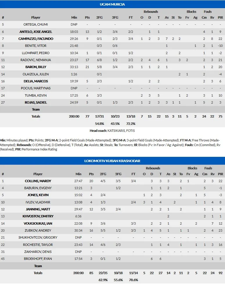 Mejoría sin presión: El equipo murciano, ya sin nada que jugarse contra un equipo que tampoco, mostró mejoría en el juego respecto a las últimas semanas. Hubo más fluidez; más equilibrio, siete tiros de dos frente a cinco de tres, un Radovic en la línea de liderazgo de las últimas semanas; y un Campazzo con 11 de valoración en el primer cuarto con sólo un punto anotado. La calidad de Rochestie permitió a Lokomotiv llegar cerca al final del primer cuarto 21-15.