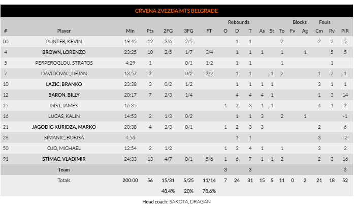 Con un partido de tan poca anotación, y con el golpe certero, y definitivo que propinó Baskonia antes de entrar en el último cuarto, Estrella Roja entregó la cuchara definitivamente. Un triplazo de Shengelia y un posterior rebote ofensivo y canasta a aro pasado del georgiano pusieron el 62-45 que finiquitó el partido por completo. De esta manera el partido quedó visto para sentencia, con un Estrella Roja que lo intentó hasta el final, pero fue insuficiente. El partido concluyó 71-56, y suma de esta manera la decima victoria al casillero vitoriano, que ya ve de reojo los puestos de ‘playoffs’.