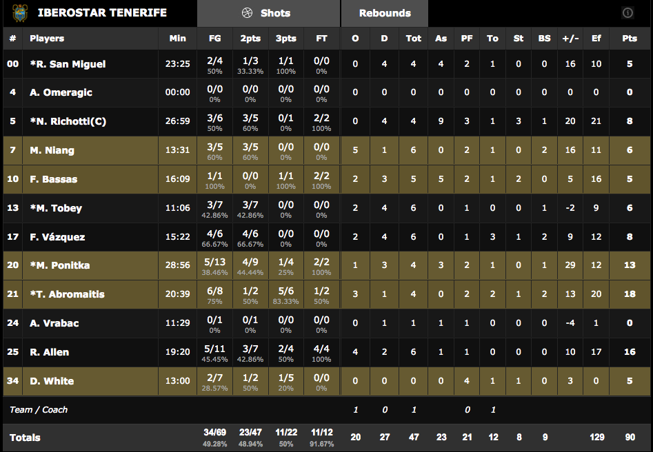 - Tiro exterior. Son los mismos jugadores que hace varias semanas, pero si está claro que las sensaciones que tienen son muy distintas. El tiro exterior se ha vuelto a convertir en un arma importantísima desde la llegada del griego. 11-22 fue el porcentaje de hoy con 6 jugadores anotando al menos un triple. Nada que ver con partidos anteriores y si se mantiene esa regularidad exterior el Iberostar será un problema para sus rivales. Hay que destacar a Tim Abromaitis con 5-6, que continua con su muy regular temporada.