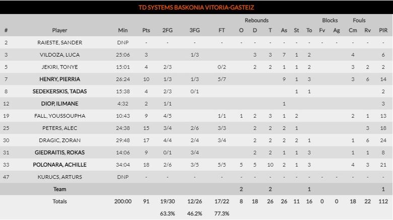 Durante ese período de tiempo los vitorianos no consiguieron sumar ningún punto, pasándose de un 89 a 91 a su favor al 95 a 91 final. Vildoza perdió un balón, Dragic y Henry no acertaron con sus triples y el siempre efectivo Polonara falló hasta tres intentos tras varios rebotes ofensivos en diferentes jugadas, mientras que Fontecchio, un dos más uno de Maodo Lo y un libre de Thiemann sentenciaban un duelo que había sido muy igualado y en el que Baskonia tuvo la delantera varias veces en el último período.