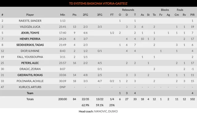 El show del argentino fue sobresaliente. Canastas de todo tipo, atacando el aro pese a la presencia de Tavares, triples y una serie de asistencias que reflejan la gran circulación de balón que ha caracterizado a Baskonia durante todo el partido, acompañado de Pierria Henry. Vildoza anotó 13 puntos y repartió 6 asistencias, anotando 2/3 en tiros de 2 y un inmaculado 3/3 desde la línea exterior. En las grandes citas siempre aparece Luca, quien para muchos ya es carne de NBA, para catalogarlo como el mejor jugador del partido.