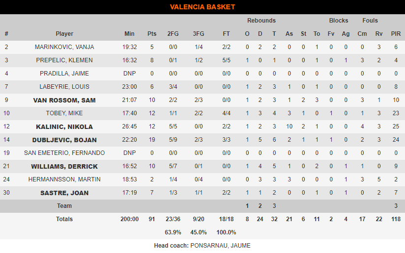 Como ya se ha dicho, Valencia Basket ganó este partido por un buen juego colectivo, pero siempre se hay una estrella que brilla más y esa fue hoy Nikola Kalinic. El serbio volvió a demostrar por qué es el chico para todo de este equipo y es una pieza que no falla para Ponsarnau. Kalinic fue el más valorado con un actuación de 12 puntos, 3 rebotes y 10 asistencias. Cabe mencionar también hoy a Bojan Dubljevic que fue el máximo anotador del encuentro con 19 puntos y capturó 6 rebotes, y a Mike Tobey que apareció en los instantes finales para firmar 12 puntos y 4 rebotes en menos de veinte minutos en pista.