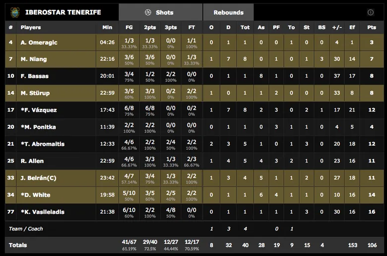 - Todos felices. A pesar de las bajas del Iberostar, el equipo no echó en falta a nadie y consiguió que todo aquel que pisase la cancha consiguiera anotar, incluso los no habituales como Omeragic o Mads Bonde. 6 jugadores visitantes pasaban la cifra de los 10 puntos anotados y además ninguno superaría los 24 minutos disputados.
