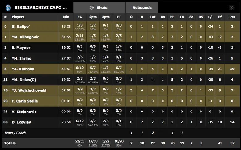 El desplazamiento a tierras italianas se antojaba complicada en una primera instancia, al no contar con Rodrigo San miguel ni Mike Tobey. El choque comenzaría puesto que ambos equipos intercambiarían canastas hasta el 9-9 a falta de 5 minutos. A partir de aquí el conjunto isleño pisaría el acelerador a fondo para infrigir un parcial ofensivo de 0-12, siendo los únicos minutos reales de competición del choque y acabar el período con 9-21. El partido no tendría más historia, puesto que los italianos no serían capaces de contener el aluvión lagunero, que anotaba 29 puntos en el segundo cuarto por los 16 de los italianos para irse a los vestuarios doblando por 25-50. No se echaba en falta a los ausentes San Miguel y Tobey, y tampoco al nuevo fichaje Akognon, que llegaba hoy a la isla.Tras salir de los vestuarios, los locales no saldrían enchufados y entrarían en bonus desde el minuto 7, algo que castigaba el conjunto aurinegro con 0-12 y ponía la ventaja en unos insalvables 30 puntos. Una ventaja que aumentaba exponencialmente a lo largo del choque pasando al pasar por encima de sus rivales sicilianos. El cuarto finalizaba con el Iberostar anotando 27 puntos y un marcador de 45-77. En el último período el conjunto de la ciudad de los adelantados no levantaba el pie del acelerador ante un Capo D’Orlando que no podía aguantar ninguna defensa sin que el Iberostar sumase en su lado. Acababa el choque con un resultado más abultado aún que la ida. 59-106