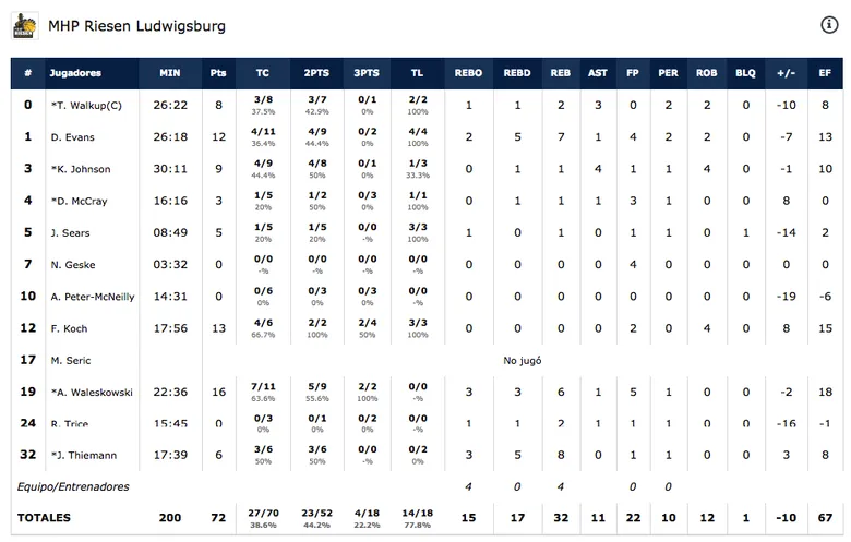 El partido comenzaba con los laguneros sin contar en sus filas tanto con Mike Tobey como con Davin White, ambos lesionados (esguince de tobillo y rotura abdominal respectivamente). Abría el marcador Fran Vázquez con una de sus suspesiones eternas desde los 6 metros, que anotaría durante todo el partido para irse hasta los 12 puntos. El primer cuarto sería bastante trabado a la hora de fluidez anotadora, hasta que entraron en bonus los locales por exceso de faltas alemanas; esto permitiría anotar 7 tiros libres para poner el 19-15 al final del período. Muy importante la aportación de energía desde el banquillo por parte de Petit Niang (6 puntos en el 1er cuarto) y esa especial conexión que tiene con Bassas (8 asistencias hoy) En el 2º cuarto se abriría brecha con un parcial 29-13 por parte de los locales, canastas al contraataque con un movimiento y un egoísmo inexistente a la hora de compartir el balón (15 asistencias al descanso) para poner un cómodo 48-28. Sería en el tercer cuarto donde se producía un apagón en el ataque lagunero; por mérito del equipo teutón y demérito de los locales, puesto que las pérdidas de balón le daban oxígeno y permitía a los alemanes acercarse hasta el 59-47. Finalmente, en el último período, las 5 referencias ofensivas del equipo hoy se turnaban en cada ataque para contrarrestar los intentos de un pegajoso Riesen para acabar sentenciando con un triple de Beirán a menos de 1 minuto y acabar con el 82-72 final.