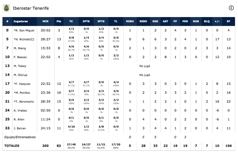 - No Tobey, no problem. En boca de muchos está el pívot de Monroe por el nivel de juego que ha estado dando últimamente, pero una lesión en el tobillo en el primer partido de la BCL le ha hecho perderse el choque contra el Joventut y el partido de hoy. Sumado a la baja de un microondas como Davin White puede haber puesto nerviosos a los aficionados canaristas. Pero hoy el equipo ha demostrado que se ha ido haciendo más compacto, hasta tal punto de no notar las ausencias de los dos americanos. Tanto Richotti (13), como Beirán (11), Fran Vázquez (12), Tim Abromaitis (15) y un Mateusz Ponitka diferencial (16) se han echado al equipo a sus espaldas para conseguir la victoria. Además, mejorando el porcentaje de tiros de 3 que venía firmando el equipo, anotando hoy 11-21, un porcentaje más que interesante y que si se mantiene será muy díficil para cualquier rival que se preste.