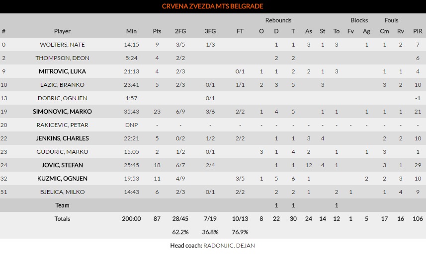 Todo ello quedó sepultado tras un dos más uno de Kuzmic y 5 puntos seguidos de Simonovic (que acabaría anotando 23 puntos con buenos porcentajes): 60-79. Y, acto seguido, volvían los 20 de diferencia con una canasta de Jovic. De nuevo, los baskonistas se veían superados y el dominio del juego cambiaba de bando. Los últimos minutos solo fueron un correcalles en el que cada equipo intentaba que la diferencia fuera algo más favorable para sus intereses de basket-average. Al final el marcador reflejaba un 69-87, con una valoración algo más clara en lo que respecta a sensaciones: 65-106. Estrella Roja dominó en todos los apartados: rebotes, pérdidas (20 del Baskonia), robos, asistencias, etc.