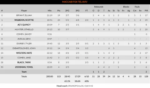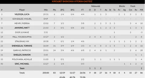 Los datos de una noche histórica: El partido de hoy, además de una derrota difícil de digerir para el conjunto alavés, ha dejado varios datos y estadísticas curiosas, y dignas de resaltar. Respecto a Maccabi: Por muchos momentos del partido, hasta bien entrados en el último cuarto, su porcentaje de triples había sido del 70%. Algo que de haber acabado así hubiese sido un hito sin precedentes. Además de eso, la regularidad del partido de los de Tel Aviv ha sido asombrosa, ya que en ningún cuarto han bajado de los 27 puntos de anotación. Por si fuera poco, Maccabi ha anotado 17 triples a lo largo del partido de hoy, logrando así su mayor marca histórica. Nunca antes había anotado tanto desde más allá del arco. Respecto a Baskonia, ha recibido la mayor derrota en casa de su historia; superando un 65-94 que le endosó el mismo Maccabi en 2002. Hoy, los israelíes han superado esa marca con una diferencia de 30 puntos. Noche para el recuerdo para unos, y para el olvido para otros en un partido que sin duda pasará a los annales de la Euroliga.