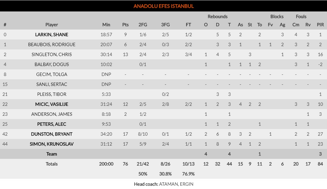 Con los once últimos puntos de su equipo, Krunoslav Simon se echó el ataque de los suyos a la espalda, mientras dominaban el rebote, por lo que la ventaja se puso por encima de los 10 puntos (61-50 min. 32). Pablo Laso veía como se le ponía cuesta arriba el encuentro, y la fluidez y ritmo del mismo no les favorece, ni son capaces de hacerse con él. El Real Madrid se estaba enredando en la tramada defensiva de Anadolu Efes, quien ahogaba a los de Laso en su juego. Muy eficaz desde el triple y dominantes en la pintura, no han tenido la opción de pelear el rebote ofensivo y el conjunto turco puso el +19 a falta de 2 minutos, prácticamente sentenciados. Completamente anulados, y el derechazo final lo dan los locales para quedarse con la victoria en su feudo (76-60).