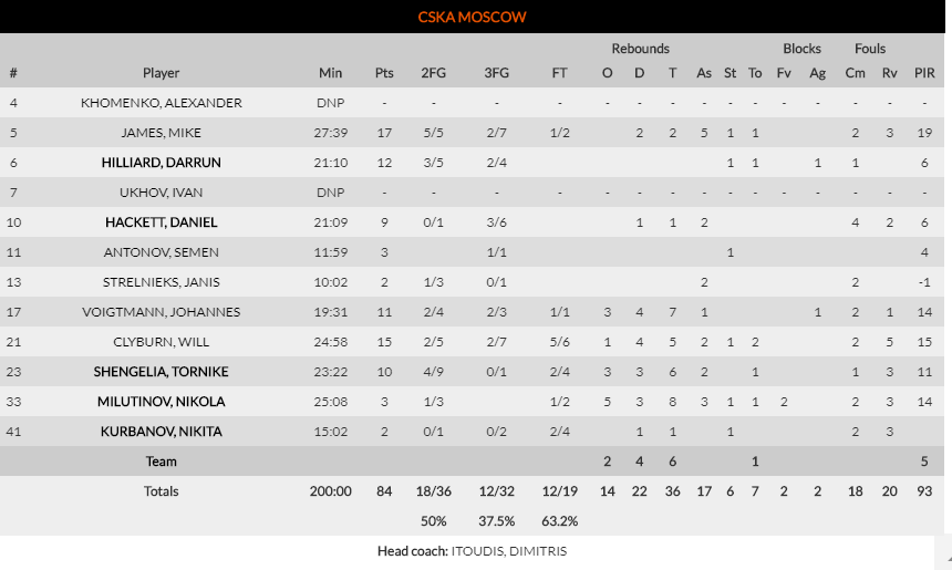 La derrota de Valencia Basket es en parte por la falta de continuidad y de ideas, pero también tiene parte de culpa el buen juego ofensivo de CSKA Moscú. Mike James fue el gran nombre del partido, aunque no se puede pasar por alto que el jugador dejó también protagonismo para algunos de sus compañeros. Hasta cuatro jugadores tuvieron más de dos dígitos de anotación y otros como Daniel Hackett se quedaron cerca, pero aportaron en la circulación de balón. Cabe destacar a Johannes Voigtmann en el tiro exterior en los últimos minutos del partido, Will Clyburn y Darrun Hilliard como mejores escuderos de James. Algo más discreto, pero aportando estuvo también Tornike Shengelia.