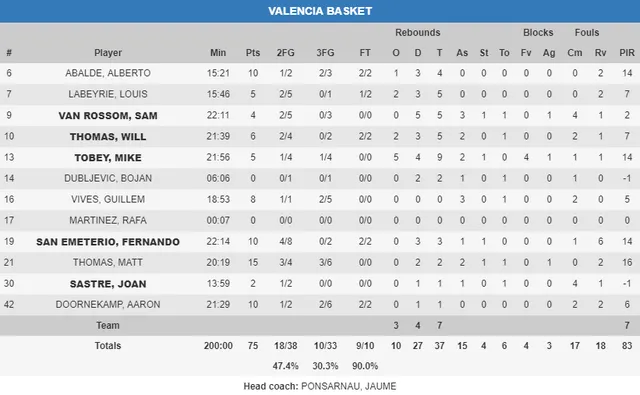 1-Juego colectivo, la mejor manera de afrontar problemas. Valencia Basket jugó hoy uno de sus partidos más colectivos, con hasta seis jugadores con buenas actuaciones. En ataque, Matt Thomas, Aaron Doornekamp, Alberto Abalde o Fernando San Emeterio fueron fundamentales, los triples de Vives, o al igual que en defensa Mike Tobey o Sam Van Rossom. 15 puntos anotó el norteamericano para ser el máximo anotador del encuentro, y le siguieron con 10 puntos cada uno Doornekamp, Abalde y San Emeterio. También cabe destacar los 8 de Guillem Vives. De estos cinco, solo San Emeterio salió de titular, con lo que demuestra el hambre y las ganas de los hombres de banquillo, que fueron importantes para conseguir esta victoria.