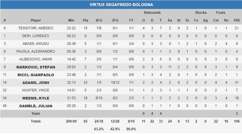 El peso anotador de lo equipo lo llevó Josh Adams y estuvo bien acompañado por Kyle Weems y Amedeo Tessitori, pero quien surtió de balones a todos esos jugadores fue el base serbio. El veterano Markovic no tenía el día de cara al aro (0 de 4 en triples) pero repartió 11 asistencias para ser el principal protagonista de las 24 que repartió la Virtus. Hace muchos años que Markovic sabe lo que puede aportar en una cancha de baloncesto y hoy fue otra buena muestra de ello.