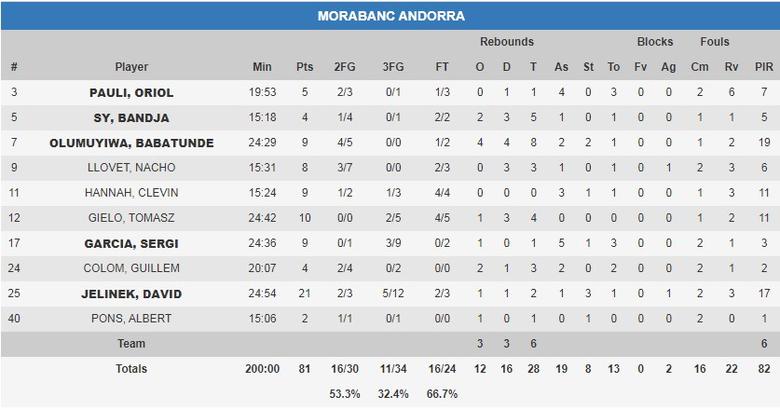 Ibon Navarro tenía hoy a su disposición a solo 10 jugadores, entre ellos el canterano Albert Pons. La lista de bajas no es más larga pero hay que ver la importancia de los nombres con Jeremy Senglin, Moussa Diagne, Tyson Pérez, Malik Dime o Haukur Pallsson. Aún así los andorrranos plantaron cara en todo momento a la Virtus y casi fueron capaces de igualar su ritmo anotador, con jugadores como David Jelinek, Babatunde o Tomasz Gielo a gran nivel. Y hay que destacar esa implicación del equipo en un partido en el que lo fácil era dejarse ir, sobre todo con un Adams desesperando a la defensa al meter todo lo que tiraba.
