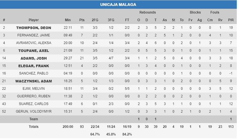 Josh Adams lidera un maravilloso trabajo coral. Es cierto que el jugón americano destacó con 21 puntos, 5 asistencias, 18 de valoración y las jugadas más espectaculares del partido, pero lo más destacable es tener hasta seis jugadores alcanzando y superando la decena de valoración y cinco haciendo lo mismo en cuanto a anotación. Pero además los que no alcanzaron esos números aportaron y todo el que pisó la pista por Unicaja contribuyó a este gran partido.