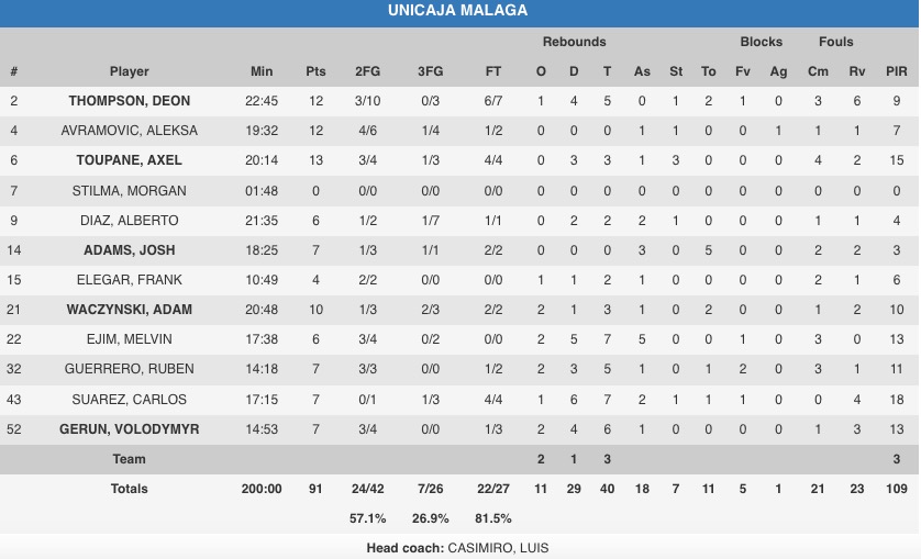 tercera falta antideportiva del partido, lo que sirvió para que el Unicaja se situara hasta 21 puntos arriba (71-50), con 3+1 de Alberto Díaz a falta de 7:14 para el final, un resultado casi imposible de salvar dada la dinámica del partido hasta ahora. Los últimos minutos de partido, solo sirvieron para que los malagueños exhibieran su potencial ofensivo ante un Asseco Arka Gdynia que fue de más a menos en el transcurso del partido. Solo Devonte Upson fue el único jugador destacado del cuadro amarillo ( 15 puntos/17 de valoración en poco más de 15 minutos de juego). Al término del encuentro, Unicaja sumó su sexta victoria ante un irreconocible Asseco Arka Gdynia por un amplio 91-69, consolidándose como líder del Grupo D y sellando su pase matemático a la siguiente ronda de la Eurocup.