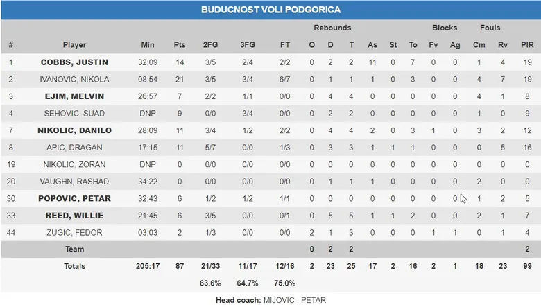 Hasta ocho jugadores de Buducnost Voli anotaron seis o más puntos. El equipo de Petar Mijovic repartió el protagonismo anotador, que recayó en Justin Cobbs en la primera parte, y en un espectacular Nikola Ivanovic en el segundo tiempo. Pero los secundarios aportaron en anotación y a punto estuvieron de dar la sorpresa y llevarse el partido.