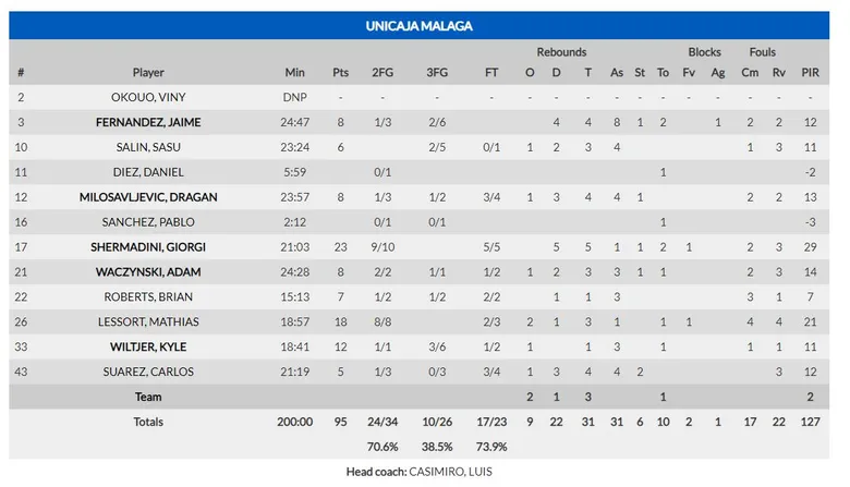 El vendaval malagueño no paró y la diferencia siguió creciendo a márgenes inimaginables antes del descanso. Brian Roberts puso una máxima de 27 (86-59, min 35) ante un Rytas que seguía impotente ante la presión de un pletórico Unicaja, imparable en la segunda parte. Lessort tomó el testigo de Shermadini (máximo anotador, con 23 puntos) y volvió a colgarse del aro, acabando con 17 puntos y un impoluto 8/8 en tiros de 2. La relajación final (Casimiro hizo debutar en Eurocup al imberbe Pablo Sánchez, el debutante más joven de la historia de Unicaja con 16 años), y el Rytas pudo recortar ligeramente la diferencia (95-76 fue el marcador final). Los de Málaga suman su quinta victoria y siguen peleando el liderato del grupo al Unics Kazan.