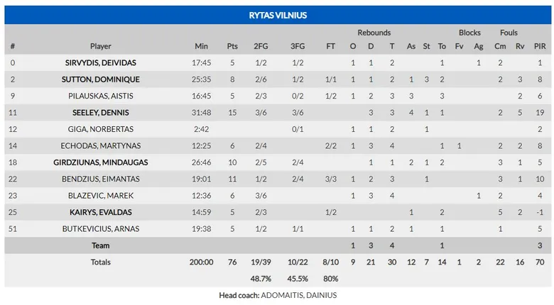 DJ SEELEY, TERMÓMETRO DEL RYTAS VILNIUS. El ex base-escolta de Manresa y Gran Canaria llevó la manija lituana a la perfección en la primera parte, anotando 15 puntos con 6 canastas de bella factura: triples, penetraciones, step-backs… Además encontró a sus compañeros, les repartió asistencias con facilidad, y fue el máximo responsable de la ventaja del Rytas al descanso (43-48). Sin embargo, en la segunda parte desapareció, no volvió a anotar, falló tiros fáciles, y su equipo lo acusó en un apagón terrible (28-7 en el tercer cuarto). Seeley es un buen jugador, pero a veces peca de irregular, y eso quizá le impide jugar en equipos de mayor potencial.