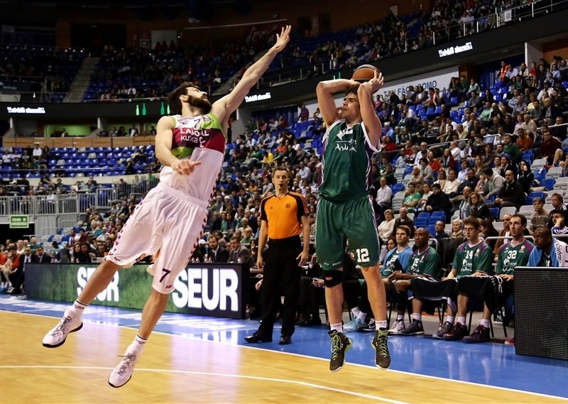 Laboral Kutxa afrontaba el partido de esta noche con la noticia de la derrota de Anadolu Efes en campo de Fenerbahçe Ülker, dejando la clasificación para el Top 8 en sus manos. Sin embargo, Joan Plaza logró motivar a los suyos, rompiendo el sueño baskonista gracias a un gran partido colectivo, liderado por Toolson (17 puntos), Granger (15) y Green, que fue clave en la primera parte, acabando el partido con 11 puntos. Suárez aportó en ambos lados, siendo despedido con una gran ovación. La respuesta baskonista se tradujo en puntos de Causeur (21 puntos y 29 de valoración) y San Emeterio (16 puntos y 22 de valoración) , pero esta vez el descontrol de los bases de Laboral Kutxa, Mike James y Darius Adams, salió cruz, siendo, por desgracia, decisivos en la derrota de su equipo. Más por sensaciones que por números (entre ambos bases sumaron 16 de valoración), pues los bases de Unicaja controlaron el ritmo del partido en todo momento. Laboral Kutxa penó su mal día en el tiro exterior, con 6/27, un 22%, aunque sí lograron responder al inicio de Unicaja bajo los tableros, logrando dominar el rebote. Al final, 93 a 84, acabando así con el sueño europeo de Laboral Kutxa.