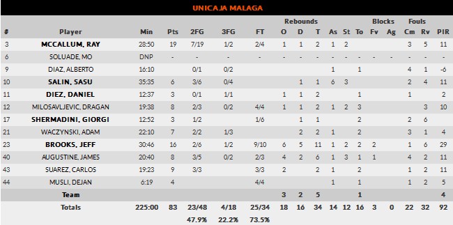 Sin referencias ofensivas Unicaja. Ante la ausencia de Nedovic, ningún jugador del equipo malagueño dio el paso adelante esperado. Como dato, sólo Mc Callum anotaba más de una canasta en el primer tiempo. El base americano no tuvo una noche acertada en el tiro (8/21 en tiros de campo) pero al menos tiró del carro y no le quemó la bola.